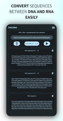 DNA2RNA je moćan alat za konverziju DNA i RNA sekvenci. Generiše komplementarnu DNA, vrši translaciju RNA i prikazuje aminokiseline u različitim formatima. Omogućava lako deljenje i kopiranje rezultata, uz podesivo rastojanje kodona.